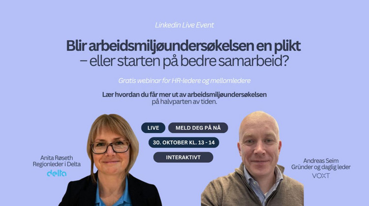 Det skjer oftere enn man tror når man bygger noe fra bunnen! Sammen med Anita Røset, regionleder i Delta, arrangerte vi vårt aller første webinar – om hvordan man faktisk følger opp en arbeidsmiljøundersøkelse, og får reelle endringer ut av resultatene.