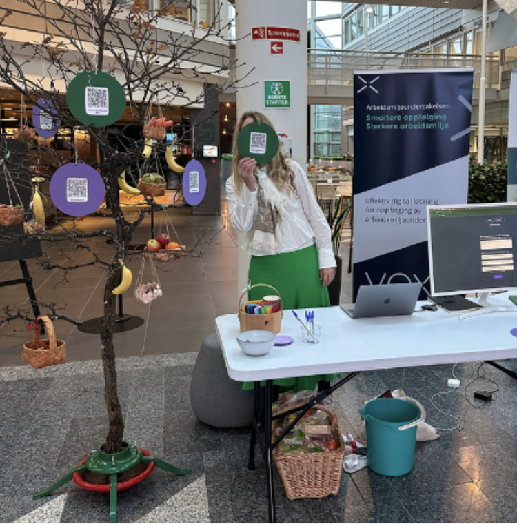Der viste vi frem VOXT-løsningen, snakket med mange engasjerte deltakere og gjorde noe litt annerledes: Et lite eiketre (forsiktig fraktet i morgentimene), neverkurver fylt med frukt, grønnsaker og sjokolade, og QR-koder som ga deltakerne tilgang til Guiden for oppfølging av arbeidsmiljøundersøkelser eller mulighet til å melde seg på nyhetsbrevet vårt.